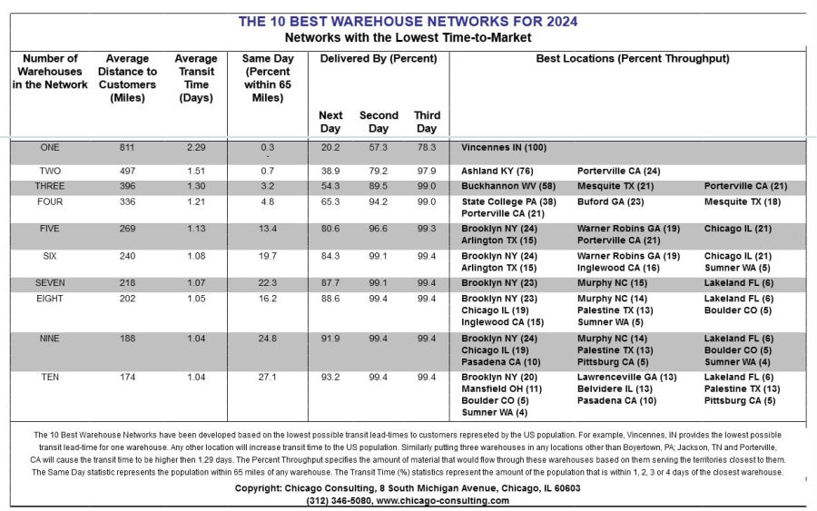 The 10 Best Warehouse Networks have been developed based on the lowest possible transit lead-times to customers represented by the US population. For example, Vincennes, IN provides the lowest possible transit lead-time for one warehouse. Any other location will increase transit time to the US population. Similarly putting three warehouses in any locations other than Boyertown, PA; Jackson, TN and Porterville, CA will cause the transit time to be higher then 1.29 days. The Percent Throughput specifies the amount of material that would flow through these warehouses based on them serving the territories closest to them. The Same Day statistic represents the population within 65 miles of any warehouse. The Transit Time (%) statistics represent the amount of the population that is within 1, 2, 3 or 4 days of the closest warehouse.
